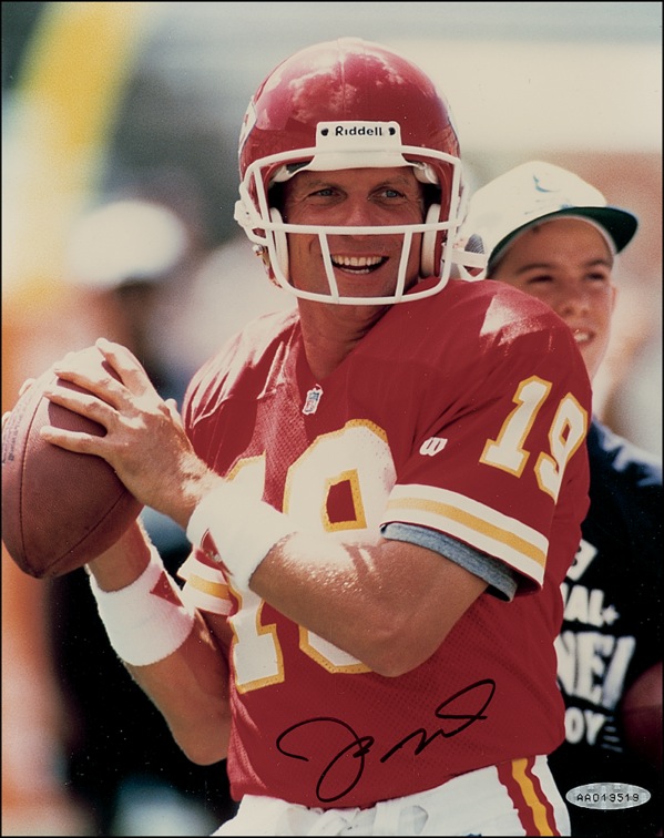 Color satin-finish 8 x 10 photo of Montana on the field as a member of the Kansas City Chiefs, signed in blue felt tip. Photo is housed in its original Upper Deck presentation folder. Accompanied by a certificate of authenticity from Upper Deck. In very fine condition. Auction LOA Steve Grad/PSA/DNA and R&R COA.