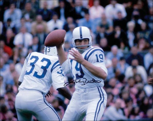 Color glossy 20 x 16 photo of Unitas preparing to pass for the Colts, signed in black felt tip. In very fine condition. Auction LOA Steve Grad/PSA/DNA and R&R COA.