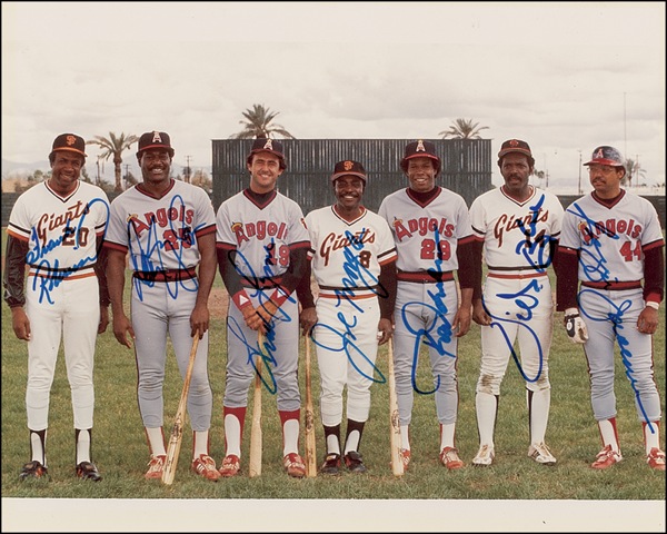 Color satin-finish 10 x 8 photo taken before a spring training game between the Angels and Giants in 1982, picturing seven baseball MVPs, signed in blue felt tip by all seven: Frank Robinson, Don Baylor, Fred Lynn, Joe Morgan, Rod Carew, Vida Blue, and Reggie Jackson. In fine condition. Auction LOA Steve Grad/PSA/DNA and R&R COA.
