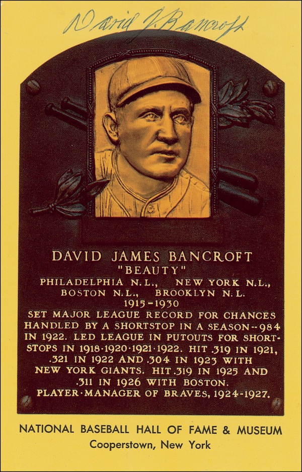 Baseball Hall of Famer who was a member of the 1921 and 1922 World Series champion Giants teams. Extremely rare gold Hall of Fame plaque card signed, signed across the top in blue ballpoint, “David J. Bancroft.” In fine condition. Auction LOA Steve Grad/PSA/DNA and R&R COA.