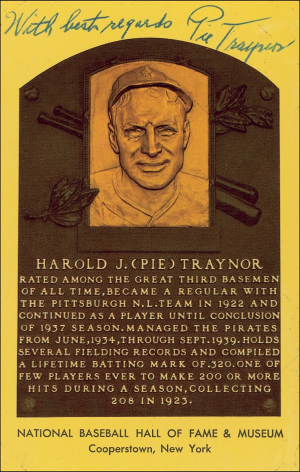 Traynor was a superior third baseman and a skillful hitter. He batted .320 during his 17-year career and never struck out more than 28 times in a season. Gold Hall of Fame plaque card signed in ballpoint along the top, “With best regards, Pie Traynor.” In fine condition, with scattered light ink marks near signature and down right edge. Auction LOA Steve Grad/PSA/DNA and R&R COA.