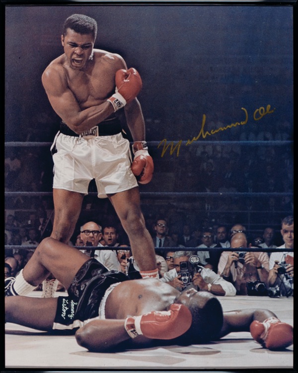 Iconic color satin-finish 16 x 20 photo of Ali taunting a fallen Sonny Liston, signed in gold ink. Framed to an overall size of 16.25 x 20.25. In fine condition, with some light rippling to horizontal edges. Auction LOA Steve Grad/PSA/DNA and R&R COA.