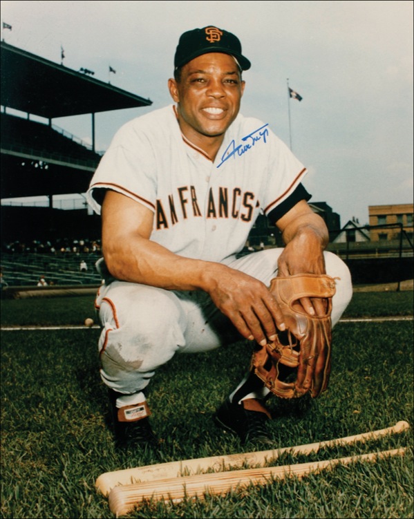 Color satin-finish 16 x 20 photo of Mays at the field before a game, signed in blue felt tip. In fine condition, with some mild edge rippling. Auction LOA Steve Grad/PSA/DNA and R&R COA.