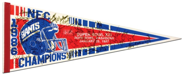 Super Bowl XXI New York Giants souvenir pennant, 30” long, signed in black felt tip by over thirty team members, coaches, and executives. Signers include: Wellington Mara, Romeo Crennel, Phil Simms, Ron Erhart, Jeff Rutledge, Vince Warren, Terry Kinard, Ottis Anderson, and Bill Parcells. Some light contrast to some signatures, and light haloing to most signatures, otherwise fine condition. Auction LOA Steve Grad/PSA/DNA and R&R COA.