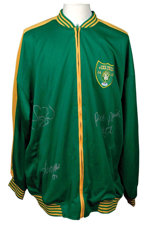 Official Hardwood Classics Boston Celtics throwback warm-up jacket signed in silver ink on the front by Larry Bird, Robert Parrish, and Kevin McHale. Accompanied by a certificate of authenticity from PSA/DNA. In very fine condition, with a PSA/DNA authentication label affixed to jacket. Auction LOA Steve Grad/PSA/DNA and R&R COA.