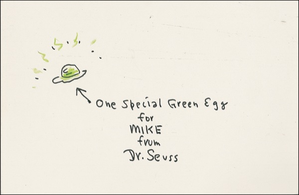 Original ink and color pencil sketch of a green egg on a white 6 x 4 card, signed and inscribed “One special green egg for Mike from Dr. Seuss.” Tiny chip to one corner and a few very subtle bends and faint streaks of soiling, otherwise fine condition. R&R COA.