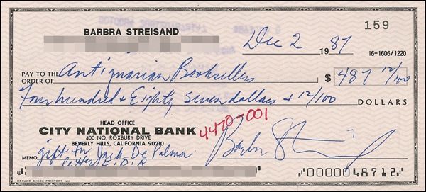 Personal check, 6 x 2.75, filled out and signed by Streisand, payable to Antiquarian Booksellers for $487.12, December 2, 1987. Memo line denotes Streisand was buying a gift for Jack DePalma. In fine condition, with small tear to bottom edge, light show-through from stamps on reverse, and a red ink notation over single stroke of signature. R&R COA.