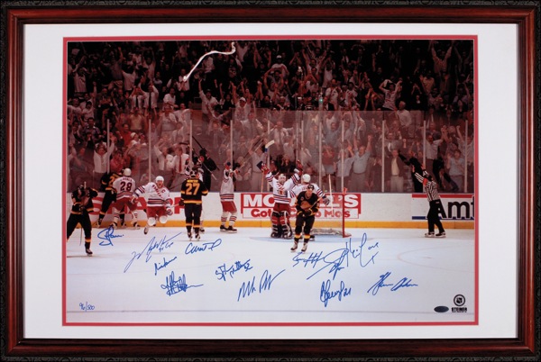 Limited edition color glossy 24 x 16 photo of the 1994 New York Rangers celebrating their Stanley Cup victory over Vancouver, #96/500, signed in blue felt tip by twelve members of the team, including: Mark Messier, Stephane Matteau, Jeff Beukeboom, Mike Richter, Glenn Anderson, and Kevin Lowe. Double matted and framed to an overall size of 31.5 x 20.25. Accompanied by a certificate of authenticity from Steiner. In very fine condition. Auction LOA Steve Grad/PSA/DNA and R&R COA. Oversized.