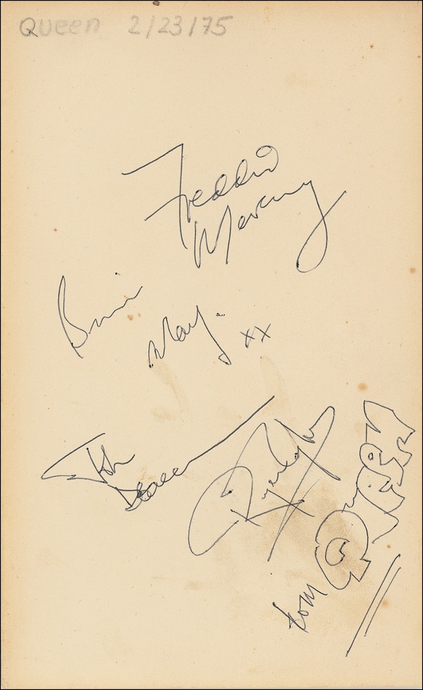 Ballpoint signatures, “Freddie Mercury,” “Brian May,” “John Deacon,” and “Roger Taylor,” on an off-white 5 x 8 sheet, with Taylor adding “From Queen,” under his signature. Collector’s date notation of February 23, 1975, at top, and some scattered light soiling and foxing, lightly affecting Taylor’s and Deacon’s signatures, otherwise fine condition. COA Roger Epperson/REAL and R&R COA.