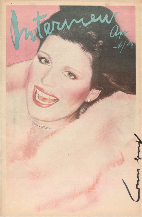 Complete issue of Interview magazine for April 1978, featuring an image of Lucy Arnaz on the cover, signed vertically in black felt tip, “Andy Warhol.” In fine condition, with typical mild toning. R&R COA.
