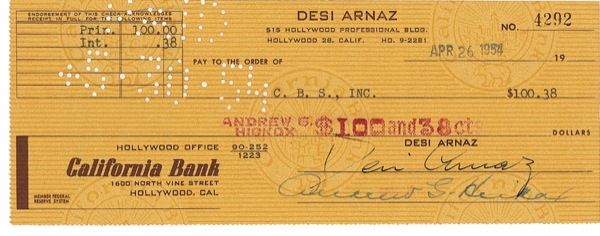 Two personal checks, one each signed “Lucille Ball Arnaz” (to AMPAS, 1955) and “Desi Arnaz” (to CBS, 1954). Usual bank stamps and punch cancellations (the latter touching “Lucille”) and light vertical folds (touching first names), otherwise fine condition. R&R COA.