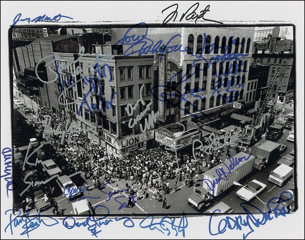 Satin-finish 14 x 11 photo of a ticket line outside of the Fillmore East, signed in felt tip and ink by twenty alumni of the famous venue. Signers are: Mike Love of the Beach Boys, Paul Kantner of Jefferson Airplane, Doug Cosmo Clifford of Creedence Clearwater Revival, John Mayall, David Nelson of New Riders of the Purple Sage, Kim Simmonds of Savoy Brown, Sly & the Family Stone’s Jerry Martini and Cynthia Robinson, Neal Schon of Santana, Quicksilver Messenger Service’s David Frieberg and Gary Duncan, Blue Cheer’s Dickie Peterson and Paul Whaley, Screamin Scott Simon of Sha Na Na, Poco’s Paul Cotton and Rusty Young, Lonnie Jordan of War, Tom Constanten of the Grateful Dead, Tom Paxton, and Livingston Taylor. In very fine condition. R&R COA.