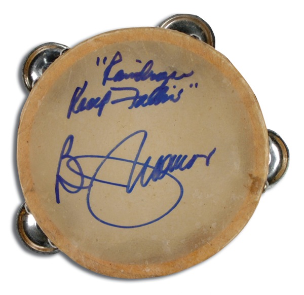Off-white 6” tambourine, signed in blue felt tip, “Raindrops Keep Falling, B. J. Thomas.” Accompanied by a photo taken at time of signing. In fine condition. R&R COA.
