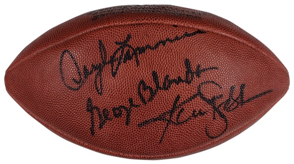 Official Wilson NFL football signed in felt tip on the side panels by Raider quarterbacks Ken Stabler, Jim Plunkett, George Blanda, and Daryl Lamonica. In fine condition, with ball a bit under inflated. Auction LOA Steve Grad/PSA/DNA and R&R COA.