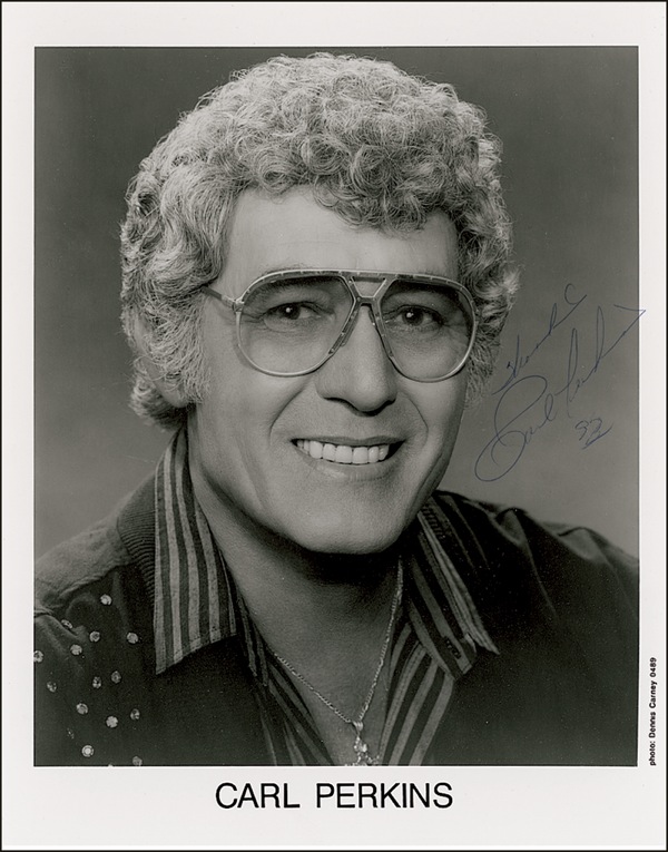 Satin-finish 8 x 10 photo, signed in ballpoint “Thanks, Carl Perkins, 93.” In very fine condition. COA Roger Epperson/REAL and R&R COA.