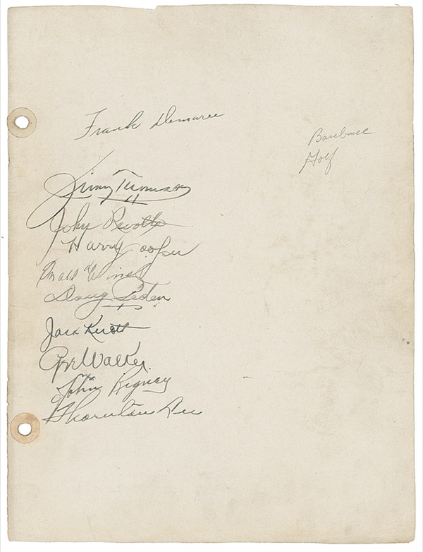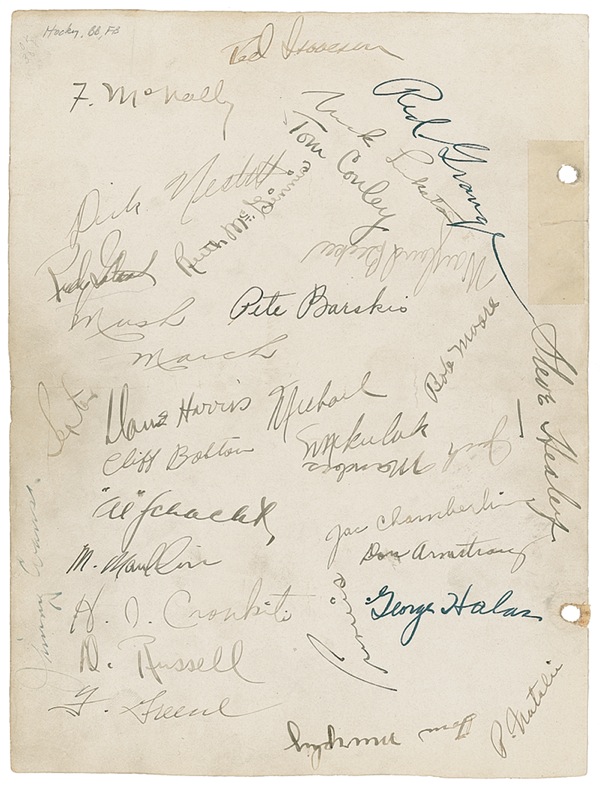 Two items: Vintage fountain pen signatures, “Red Grange” and “George Halas” on an off-white sheet bearing approximately 30 other signatures (together with a similar sheet with 10 additional signatures); and a two-page 1984 TLS signed “Helen Stephens” [1936 Olympic track medalist]. In very good to fine condition, with light soiling, creases and tears (a few tape repairs) and filing holes to first item. Auction LOA Steve Grad/PSA/DNA and R&R COA.