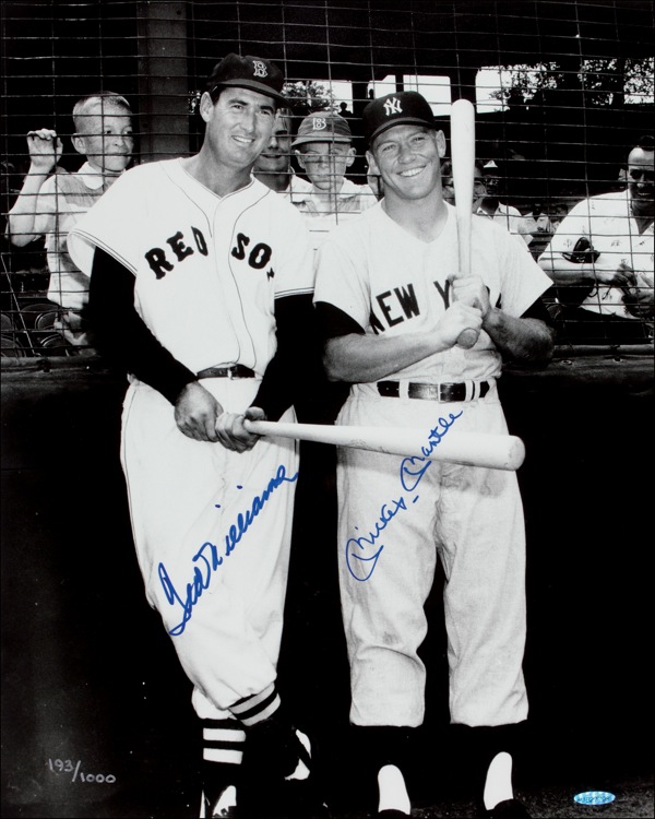 Limited edition satin-finish 16 x 20 photo, numbered 193/1000, signed in blue felt tip “Ted Williams” and “Mickey Mantle.” Accompanied by an Upper Deck certificate of authenticity. Small authentication hologram label and a few subtle dings, otherwise fine condition. Auction LOA Steve Grad/PSA/DNA and R&R COA.