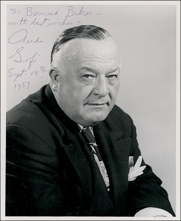 American composer (1892–1972) best known for making the original arrangement of Gershwin’s Rhapsody and Blue and for his own perennially popular concert staple, the Grand Canyon Suite. Vintage glossy 8 x 10 photo, signed and inscribed in ballpoint, “To Bernard Baker with best wishes, Ferde Grofé, Sept. 14th, 1959.” A few small, faint creases, otherwise fine, clean condition. R&R COA.