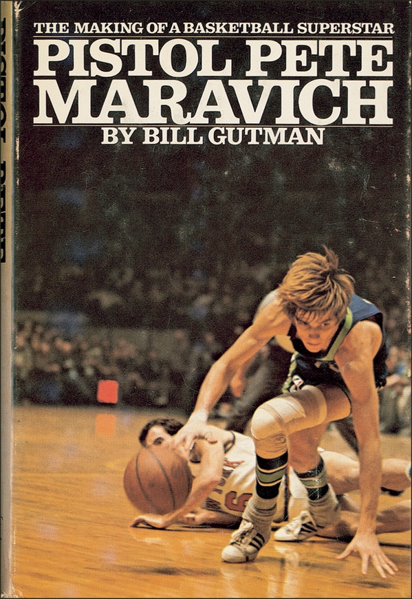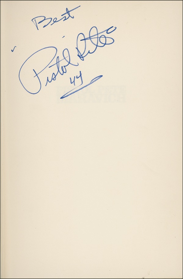 Spectacular athletic showman (1947–1988) who did much to popularize the game of basketball in the 1970s. He died of a heart attack at the age of forty while playing a pickup three-on-three game in a California gym. Signed book: Pistol Pete Maravich. First edition, first printing. NY: Grosset and Dunlap, 1972. Hardcover with dustjacket, 6 x 8.5, 192 pages. Signed on the first free end page in blue felt tip, “Best Pistol Pete 44.” In fine condition, with a bit of light wear to dustjacket. Auction LOA Steve Grad/PSA/DNA and R&R COA.