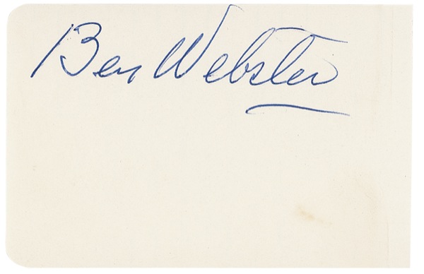 American jazz saxophonist (1909–1973) generally regarded, along with Coleman Hawkins and Lester Young, as one of the three greatest “swing tenors.” Beginning in 1940, Webster served as the first major tenor soloist in Duke Ellington’s orchestra; after their fruitful collaboration ended in discord, Webster worked with a variety of other distinguished jazz artists and spent the last decade of his career living and playing in Copenhagen. Scarce vintage ballpoint signature, “Ben Webster,” on an off-white 3.75 x 2.25 album page. In very fine, clean condition. R&R COA.
