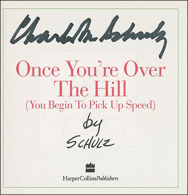 Signed book: Once You’re Over the Hill (You Begin to Pick Up Speed). First edition, first printing. NY: Harper Collins, 1997. Hardcover with dustjacket, 6.25 x 6.25. Signed on the title page in black felt tip, “Charles M. Schulz.” In very fine condition. R&R COA.