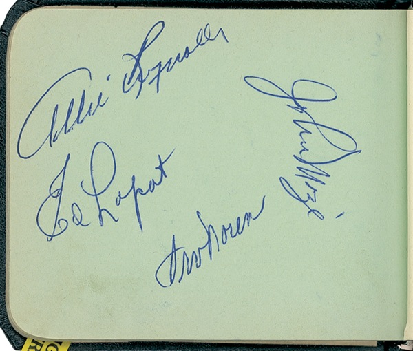 Leatherbound autograph album, 6.25 x 4.5, signed inside in ballpoint and pencil by approximately 250 athletes, with multiple signatures to most pages, and many back to back. Signers include: Hal Bevan, Bullet Joe Bush, John [Jack] Coombs, Larry Doby, Bob Feller (2), Rick Ferrell, Howie Fox, Mike Garcia (2), Mule Haas, Sam ‘Toothpick’ Jones, Jim Konstanty, Dave Koslo, Ed Lopat, Al Lopez, Ted Lyons, Clyde Milan, Bing Miller, John Mize, BoBo Newsome, Danny O’Connell, Steve O’Neill, Pete Reiser, Allie Reynolds, Ira Thomas, Hank Thompson, Fred “Cy” Williams, Sam Zoldak, Sam Baugh, Steve Van Buren, Art Donovan, Gino Marchetti, Charlie Trippi, and Abe Saperstein. In fine overall condition. Auction LOA Steve Grad/PSA/DNA and R&R COA.