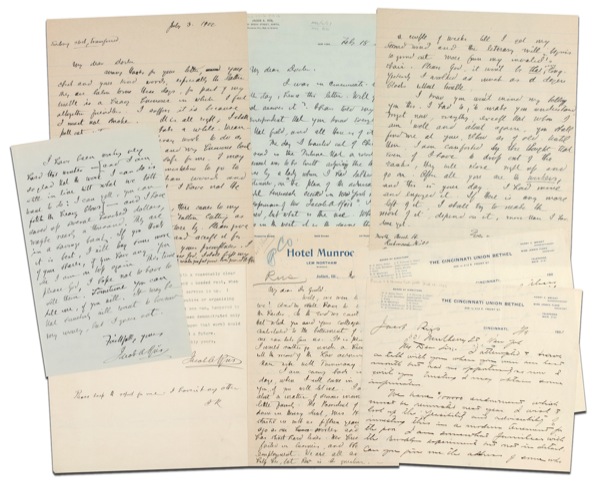 Danish-American writer, photographer, and activist (1849–1914) best known for his work in exposing and improving the squalid conditions endured by the poor in New York City. His pioneering 1891 photojournalistic volume, How the Other Half Lives, remains a touchstone in the history of both urban photography and social reform. Six ALS and one partial TLS, signed “Jacob A. Riis” (five) and “J. A. Riis,” various lengths and formats, 1900–1903. Riis writes to various recipients on his health, work, and personal matters. Some excerpts: “I am glad you liked the ‘auto.’ Truly, I like to write it, and I shudder at what is coming. It is easy to write of the old days. The new are all a muddle to me. But that riddle will be solved as so many other, when it has to be. I have been working very hard this winter—and I am so glad that the work I can do is still in line with what we both want to do … and I have saved up several hundred dollars, maybe nearly a thousand…. I [hope] that I may with a reasonably clear conscience ask for my retirement [as General Agent of the Council of Confederated Good Government Clubs] to private life and a needed rest, when with the adjournment of the legislature my year of service is up…. In the end we can’t lose, and that which you and your colleagues have contributed to the betterment of New York no one can take from us. It is permanent. I would rather go under a hundred times with the record of the … administration than with … Tammany…. I suppose you have heard that I am ill. It was the night of our meeting with the Tenement House … that I was seized with heart trouble on my way home…. I suppose I have overdone things a little in the past, and I will just have to get used to the slower pace, that is all…. I have never had time to make money…. Even if I have to drop out of the ranks, they will close right up and go on. After all you are the workers, and this is your day. I had mine and enjoyed it…. The day I traveled out of Chicago, I read in the Tribune that a model tenement was to be guild adjoining the Hull House by a lady whom I had talked with at dinner, on ‘the plan of the admirable model tenement erected in New York under the supervision of Mr. Jacob A. Riis.’ I fumed, but what is the use…. I want you to know that I discourage the notion that I created the world…. I have lots of literary work to do as soon as I get my head … back to do it with….“ Scattered light handling wear, otherwise fine condition. R&R COA.