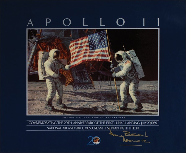 Color 28 x 23 poster commemorating the 20th anniversary of the Apollo 11 mission, signed in gold ink, “Alan Bean, Apollo 12.” Rolled and in fine condition, with a few light surface marks. COA Scott Cornish and R&R COA.