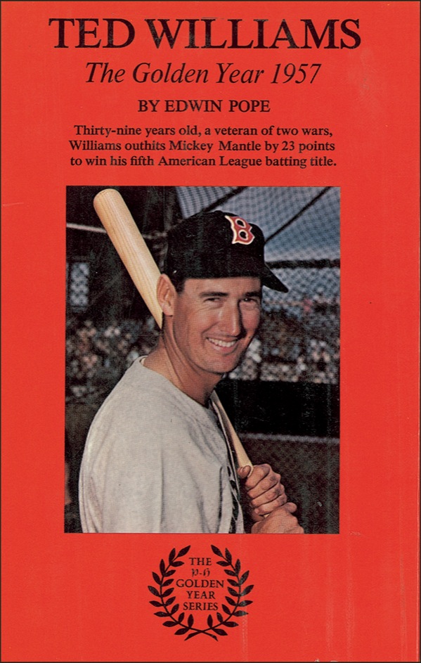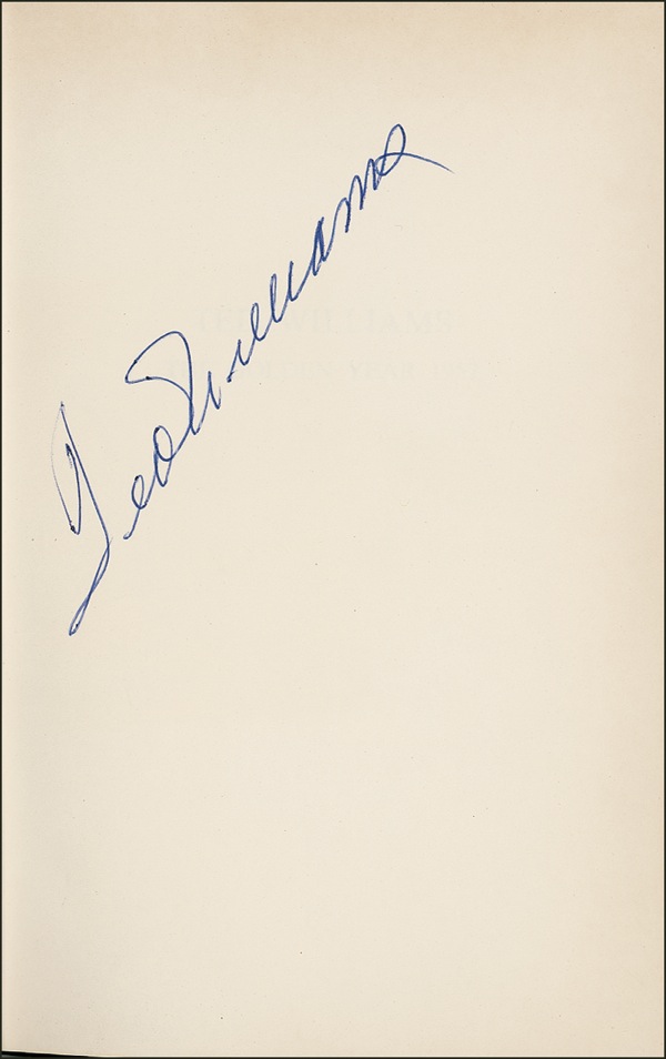 Signed book: Ted Williams: The Golden Year 1957. First edition, later printing. New Jersey: Prentice-Hall, 1970. Hardcover with dustjacket, 5.75 x 8.5, 167 pages. Signed in blue ballpoint on the first free end page. In fine condition, with some light wear and rubbing to dustjacket. Auction LOA Steve Grad/PSA/DNA and R&R COA.