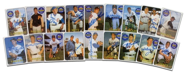 Twenty-three Sports Design baseball trading cards, issued in 1986, eighteen of which are signed in felt tip on the front by the respective player pictured, including seventeen Hall of Famers. Signers are: Ted Williams, Mickey Mantle, Sandy Koufax, Willie Mays, Lou Brock, Carl Yastrzemski, Ernie Banks (2), Billy Williams, Brooks Robinson, Jim Bunning, Matty Alou, Eddie Mathews, Duke Snider, Robin Roberts, Willie Stargell, and Whitey Ford. In fine condition. Auction LOA Steve Grad/PSA/DNA and R&R COA.