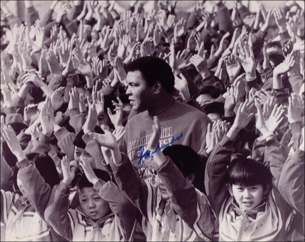 Glossy 20 x 16 photo of Ali surrounded by children while in the Orient, signed in blue felt tip. In very fine condition. Auction LOA Steve Grad/PSA/DNA and R&R COA.