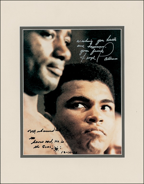 Color 7.5 x 9.5 photo of Ali glaring up at Patterson, signed in black felt tip, “Muhammad Ali, Serve God, He is the goal, 12-19-88,” and signed in silver ink, “Wishing you health and happiness, your friend, Floyd Patterson.” Double matted to an overall size of 11 x 14. In fine condition, with a barely noticeable removed Patterson inscription. Auction LOA Steve Grad/PSA/DNA and R&R COA.
