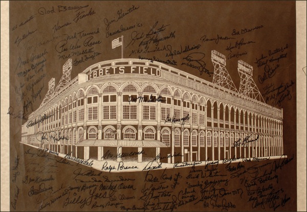 Color 26 x 18 print of the facade of Ebbets Field, signed in black felt tip by over 80 former Dodgers including: Duke Snider, Pee Wee Reese, Tom Lasorda, Carl Erskine, Billy Herman, Ralph Branca, Don Newcombe, Mickey Owen, Clyde King, Elmer Valo, Chuck Connors, Andy Pafko, Johnny Podres, Dick Williams, and Don Drysdale. Rolled and in fine condition, with some light wrinkling. Auction LOA Steve Grad/PSA/DNA and R&R COA.