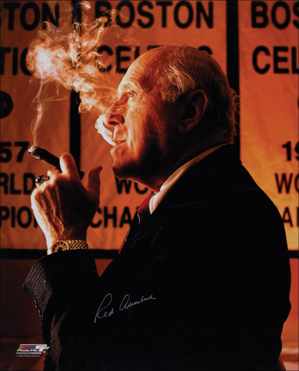 Coach and executive for the Boston Celtics. As coach of the Celtics from 1950 to 1966, Auerbach won nine NBA titles, including eight straight from 1959 to 1966 – the longest string of championships in the history of North American professional sports. After retiring from coaching, he continued to serve as general manager or president of the Celtics from 1966 until 1997, and again as president from 2001 until his death. Color glossy 16 x 20 photo of Auerbach in profile, enjoying a cigar under the Boston Celtic championship banners, signed in silver ink. In very fine condition. Auction LOA Steve Grad/PSA/DNA and R&R COA.