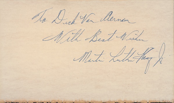 Signed book: Stride Toward Freedom. NY: Ballantine Books, 1961. Paperback, 4.25 x 7, 190 pages. Signed and inscribed in ballpoint on the inside front cover, “To Dick Van Aernam, With best wishes, Martin Luther King, Jr.” Expected age toning, mild rubbing to covers, and front hinge slightly cracked (though firmly attached), otherwise fine condition. Auction LOA John Reznikoff/PSA/DNA and R&R COA.