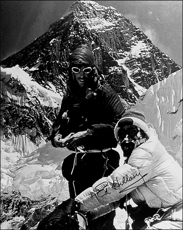 Glossy 8 x 10 photo of Hillary and Tenzing Norgay on the slopes of Everest, signed in black felt tip by Hillary. In very fine condition. R&R COA.