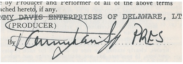 DS, signed “Sammy Davis, Jr. Pres.” at the conclusion of the first page, five pages on three sheets, 8.5 x 11, July 22, 1965. An AFTRA engagement contract related to the appearance of Dean Martin, Jr. on the television show “Sammy Davis Thanksgiving Special.” Also signed on the front page by Dean Martin, Jr. A few marginal bends, notations, and mild handling wear, otherwise fine condition. R&R COA.