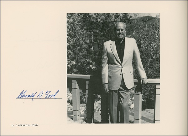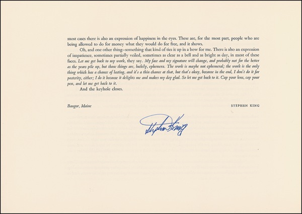 Signed book: Lord John Signatures. Limited first edition or 400 copies (this being a presentation copy). Northridge: Lord John Press, 1991. Hardcover with slipcase, 11 x 7.5, 79 pages. Signed in ink by forty-three near their respective photo or contribution: Stephen King, John Barth, James Blaylock, Robert Bloch, T. Coraghessan Boyle, Ray Bradbury, Ramsey Campbell, James Crumley, Louise Erdrich and Michael Dorris, Dennis Etchison, Gerald R. Ford, Richard Ford, Bruce Francis, Ellen Gilchrist, Jim Harrison, William Kennedy, Harry Crews, Thomas McGuane, Tony Hillerman, Ursula K. LeGuin, John L’Heureux, Elmore Leonard, Norman Mailer, Richard C. Matheson, Brian Moore, Joe Mugnaini, Joyce Carol Oates, Edna O’Brien, Robert B. Parker, Tim Powers, Reynolds Price, James Purdy, Dan Simmons, Peter Straub, Ross Thomas, Anne Tyler, John Updike, Eudora Welty, Richard Yates, Donald Westlake, James Lee Burke, and William Everson. In very fine condition. R&R COA.