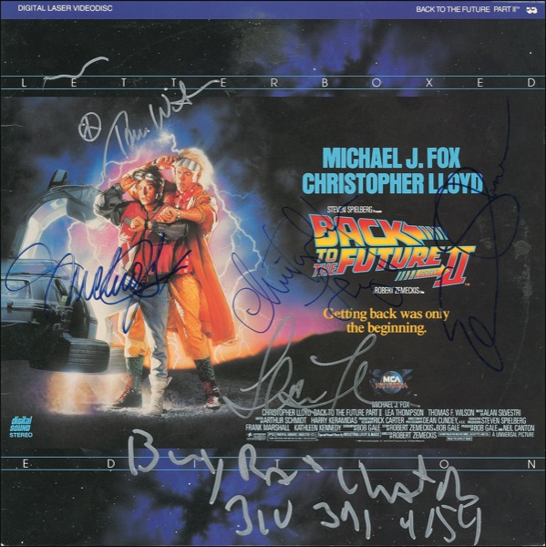 Back to the Future II laser disc, signed in-person on the front in blue felt tip and silver ink by Michael J. Fox, Christopher Lloyd, Elisabeth Shue, Lea Thompson, and Tom Wilson. Cover also bears another signature and phone number at the bottom. In fine condition, with some light contrast to a couple of signatures, and light ‘ring of wear’ to cover. The disc is not included. R&R COA.