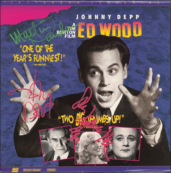 Ed Wood laser disc, signed in-person in green and red ink on the front by Johnny Depp, Martin Landau, and Sarah Jessica Parker. In fine condition, with a few edge creases, and slight irregular adhesion to Depp’s signature. The disc is not included. R&R COA.