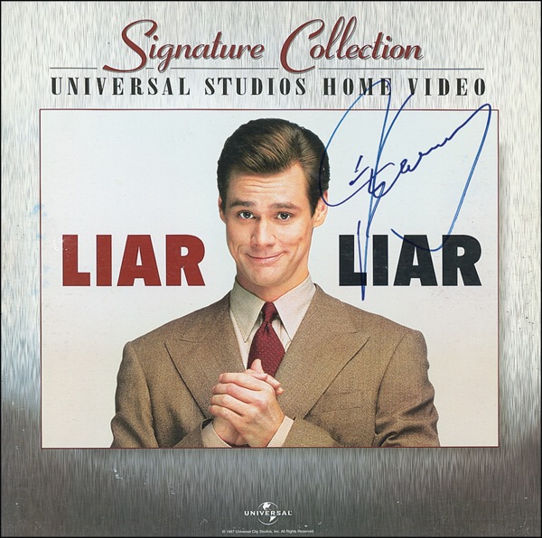 Liar Liar laser disc, signed in-person on the front in blue felt tip by Carrey. In fine condition. The disc is not included. R&R COA.