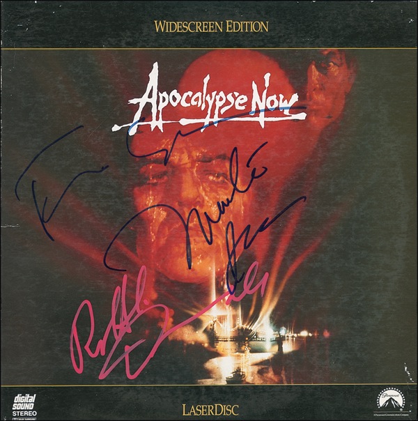 Apocalypse Now laser disc, signed in-person on the front in felt tip and ink by Francis Ford Coppola, Martin Sheen, and Robert Duvall. In fine condition, with some light wear to cover. The disc is not included. R&R COA.