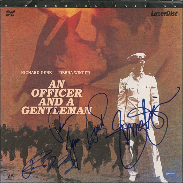 An Officer and a Gentleman laser disc, signed in-person on the front in felt tip by Richard Gere, Debra Winger, and Louis Gossett, Jr. In fine condition, with some mild edge creases. The disc is not included. R&R COA.