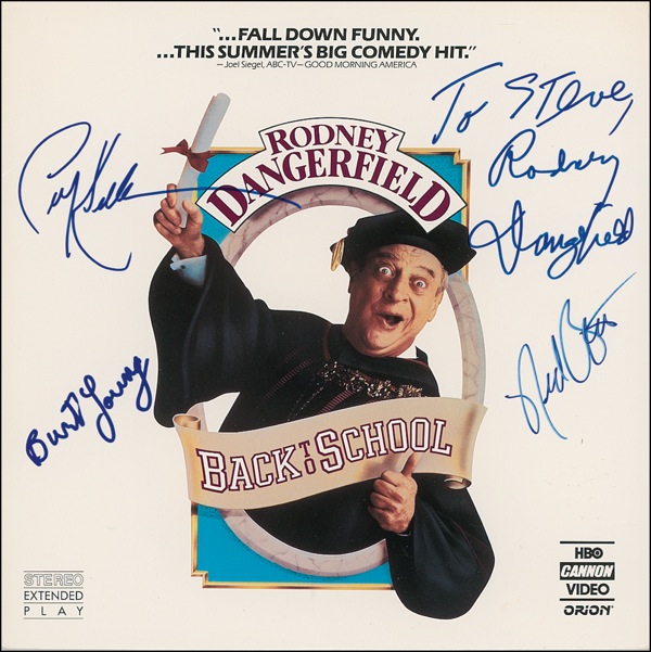 Back to School laser disc, signed in-person on the front in blue felt tip by Rodney Dangerfield, who inscribes to Steve, Sally Kellerman, Burt Young, and Ned Beatty. In fine condition. The disc is not included. R&R COA.