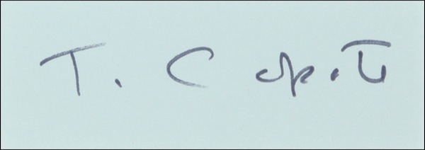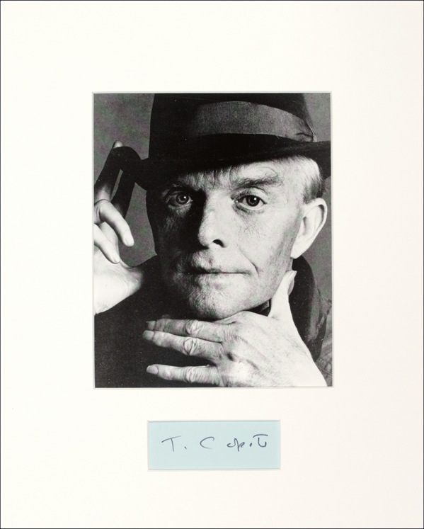 Felt tip signature, “T. Capote,” on a light blue 4 x 1.5 card matted with a photo to an overall size of 13 x 16.75. In fine condition. R&R COA.