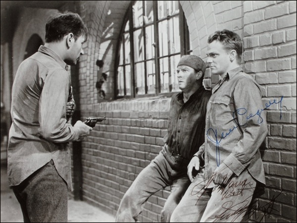 Glossy 10 x 8 photo of a scene from the 1939 gangsters-and-enterprising-reporter-behind-bars classic Each Dawn I Die, signed in blue ink “Jim Cagney” and in black ink “To Nancy, Best, George Raft.” Matted and framed to an overall size of 13.75 x 12. Slightly indistinct contrast to Raft’s last name, otherwise fine condition. R&R COA.
