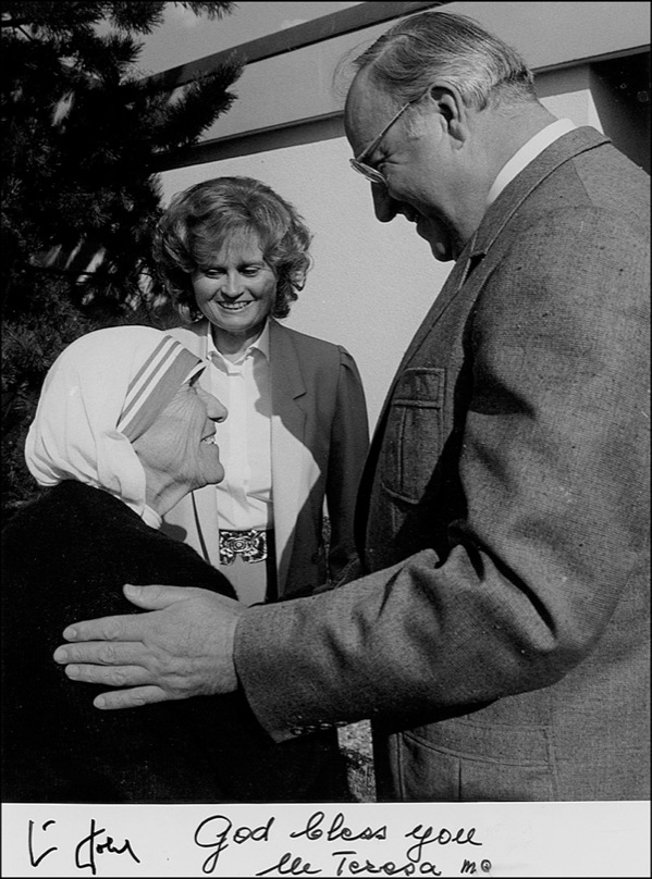 Glossy 7 x 9.5 photo of Mother Teresa shaking hands with German Chancellor Helmut Kohl, signed in the lower border in black felt tip, “God bless you, M. Teresa mc,” and also signed by Kohl. In fine condition, with a light brush to end of Teresa’s signature. R&R COA.