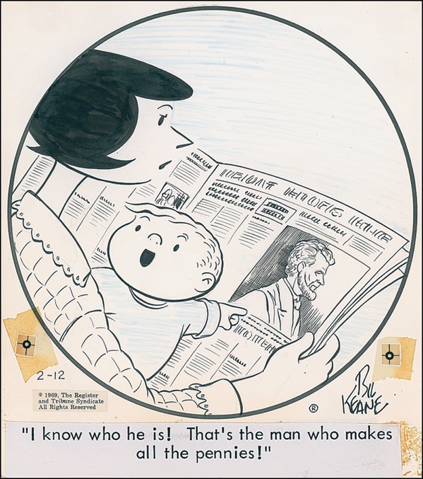 Original artwork for a one-panel daily Family Circus strip, ink on artist’s cardstock, 8.25 x 9.5, February 12, 1969, signed at lower right “Bil Keane.” Toning to a few spots of glue and tape residue, otherwise fine condition. R&R COA.