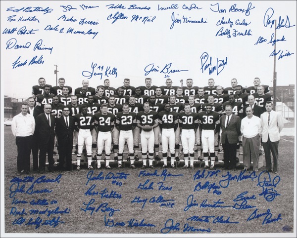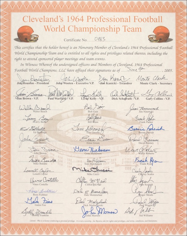 Two items: numbered 16 x 20 Honorary Member stock certificates of the 1964 Professional Football World Champion Browns, signed in felt tip by forty-two members of the team: Jim Brown, Paul Warfield, Leroy Kelly, Jim Houston, John Wooten, Jim Kanicki, Monte Clark, Dick Schafrath, Gary Collins, Walter Beach, Bob Gain, Jim Ninowski, Larry Benz, Bill Glass, Frank Parker, Bernie Parrish, Tom Goosby, Ed Bettridge, John Brewer, Ernie Green, David Raimey, Walter Roberts, Gene Hickerson, John Brown, Mike Bundra, Tom Hutchinson, Frank Ryan, Charley Scales, Mike Lucci, Lowell Caylor, Vince Costello, Clifton McNeil, Stan Sczurek, Roger Shoals, Dale Memmelaar, Ross Fichtner, Galen Fiss, Dick Modzelewski, Paul Wiggin, Sid Williams, John Morrow, and Bobby Franklin; and a satin-finish 20 x 16 team photo of the 1964 Browns, signed in black felt tip by over thirty team members, including: Jim Brown, Larry Benz, Tom Goosby, Ed Bettridge, Frank Parker, Gene Hickerson, Dick Modzelewski, Galen Fiss, Gary Collins, Mike Lucci, Walt Roberts, Jim Ninowski, Bobby Franklin, Paul Warfield, Bob Gain, John Morrow, Clifton McNeil, Lowell Caylor, Tom Hutchinson, Paul Wiggin, Jim Kanicki, and Bill Glass. In fine condition. Auction LOA Steve Grad/PSA/DNA and R&R COA.