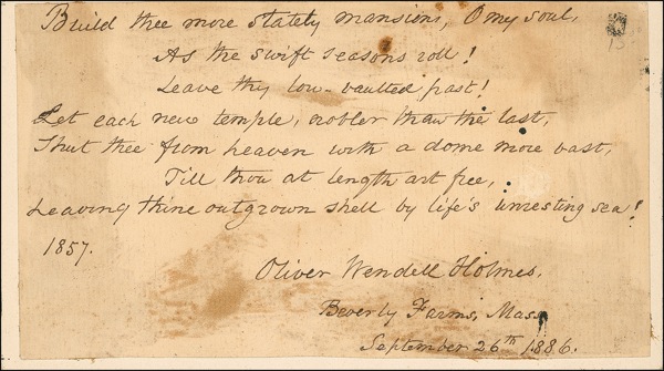 Eminent American writer (1809–1894) best known for his collection The Autocrat of the Breakfast Table and the much-anthologized poem “The Chambered Nautilus.” AQS on a tan 6.25 x 3.5 sheet affixed to a larger heavy card, the final stanza from his timeless poem “The Chambered Nautilus,” signed “Oliver Wendell Holmes” and dated Beverly Farms, Massachusetts, September 26, 1886. The quotation reads, in full: “Built thee more stately mansions, O my soul/As the swift seasons roll!/Leave thy low-vaulted past!/Let each new temple, nobler than the last,/Shut thee from Heaven with a dome more vast,/Till thou at length art free,/Leaving thine outgrown shell by life’s unresting sea!” In good condition, with mounting as noted and allover staining and soiling affecting appearance. The writing is clear and dark. R&R COA.